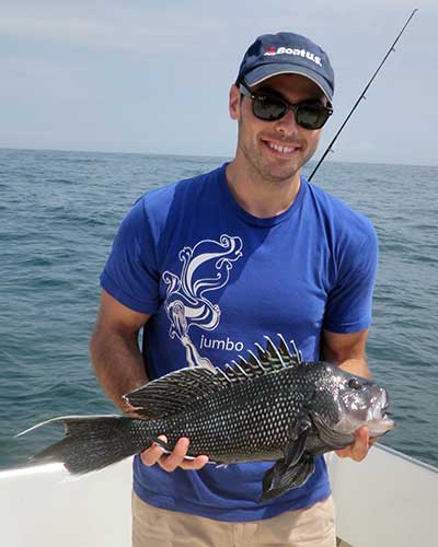 We catch Sea Bass & Porgies on light tackle with clam or squid bait from the middle of June through November.