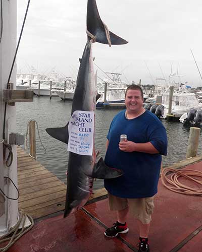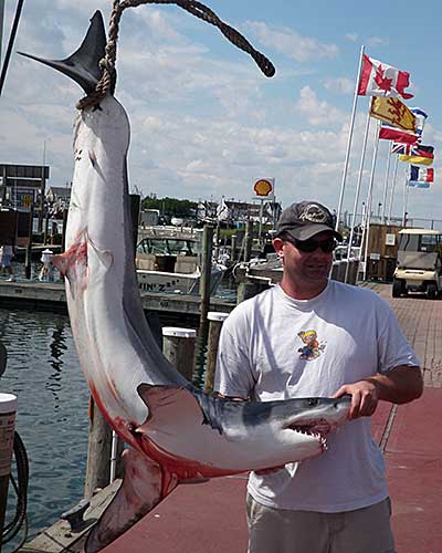 From early June through early October Sharks are big, mean, plentiful and a short ride offshore from Montauk. Blue Sharks are the first to arrive, and as the water warms the Makos and Threshers show up. Makos and Threshers are usually brought in and prepared for the table, while Blue Sharks are mostly catch and release. The tackle we use for Sharking is most often 30 and 50 pound stand-up, but of course bent butt 80s or 130s are always on board just in case a monster shows up in our slick.